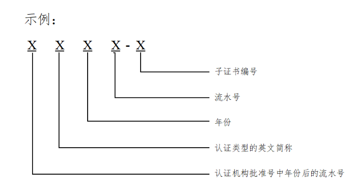 內(nèi)資認(rèn)證機(jī)構(gòu)認(rèn)證證書編號(hào)為該機(jī)構(gòu)批準(zhǔn)號(hào)的3位或4位阿拉伯?dāng)?shù)字流水號(hào);外資認(rèn)證機(jī)構(gòu)認(rèn)證證書編號(hào)為F+該機(jī)構(gòu)批準(zhǔn)號(hào)的2位或3位阿拉伯?dāng)?shù)字流水號(hào)。