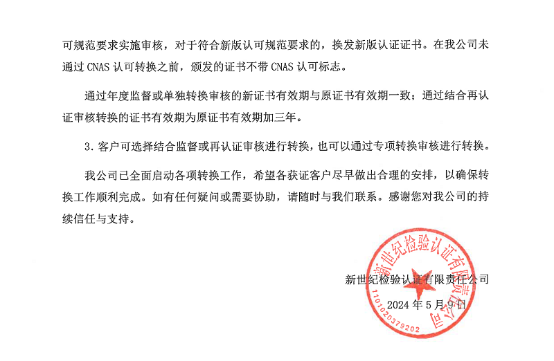2.2024年6月1日起,我公司不再實施基于舊版認(rèn)可規(guī)范的審核,開始按照新版認(rèn)可規(guī)范要求實施審核,對于符合新版認(rèn)可規(guī)范要求的,換發(fā)新版認(rèn)證證書。在我公司未通過CNAS認(rèn)可轉(zhuǎn)換之前,頒發(fā)的證書不帶CNAS認(rèn)可標(biāo)志。