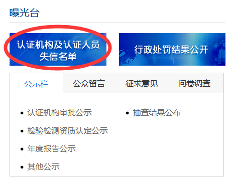 機(jī)構(gòu)曝光情況也參見國家認(rèn)證認(rèn)可委員會網(wǎng)站,如下圖: